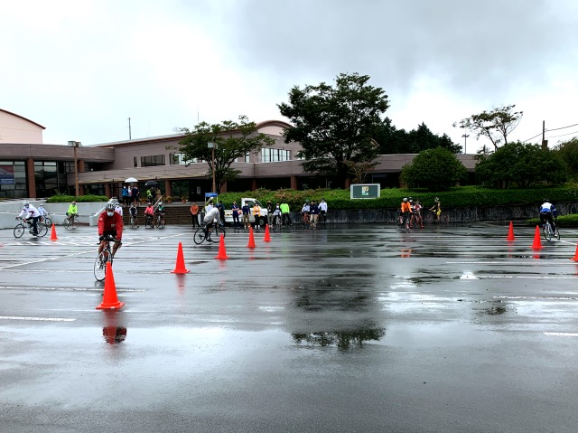今回は「東京2020オリンピック・パラリンピック競技大会300日前イベント」という位置づけでもありましたので、東京五輪自転車ロードレースのコース(TOJ富士山ステージのコースでもある)の一部を走る「体験走行会」が予定されていましたが、イベント当日はあいにくの雨模様となってしまったため、急遽、室内での座学及び駐車上でのテクニック系講習をメインとしたプログラムへと内容を変更してイベントを実施いたしました。