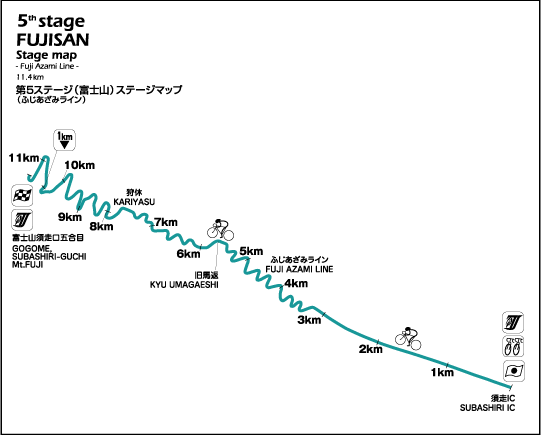 ふじあざみラインは、富士山に登る舗装路としては最も急勾配のルート。スタートは冨士浅間神社近くのふじあざみライン入口。ゴールは須走口五合目だ。ここで行われる個人タイムトライアルは前日までの総合成績の下位から順番に1人ずつ走り始める。実力がタイム差として如実に現れてくるので、総合優勝を争う有力選手にとっては勝負どころ。距離11.4kmで、高低差は1,200mというから平均勾配値は10.5%以上となる。ツール・ド・フランスのラルプデュエズでも距離13.8kmで勾配値7.9%だから非常に過酷な上り坂なのである。